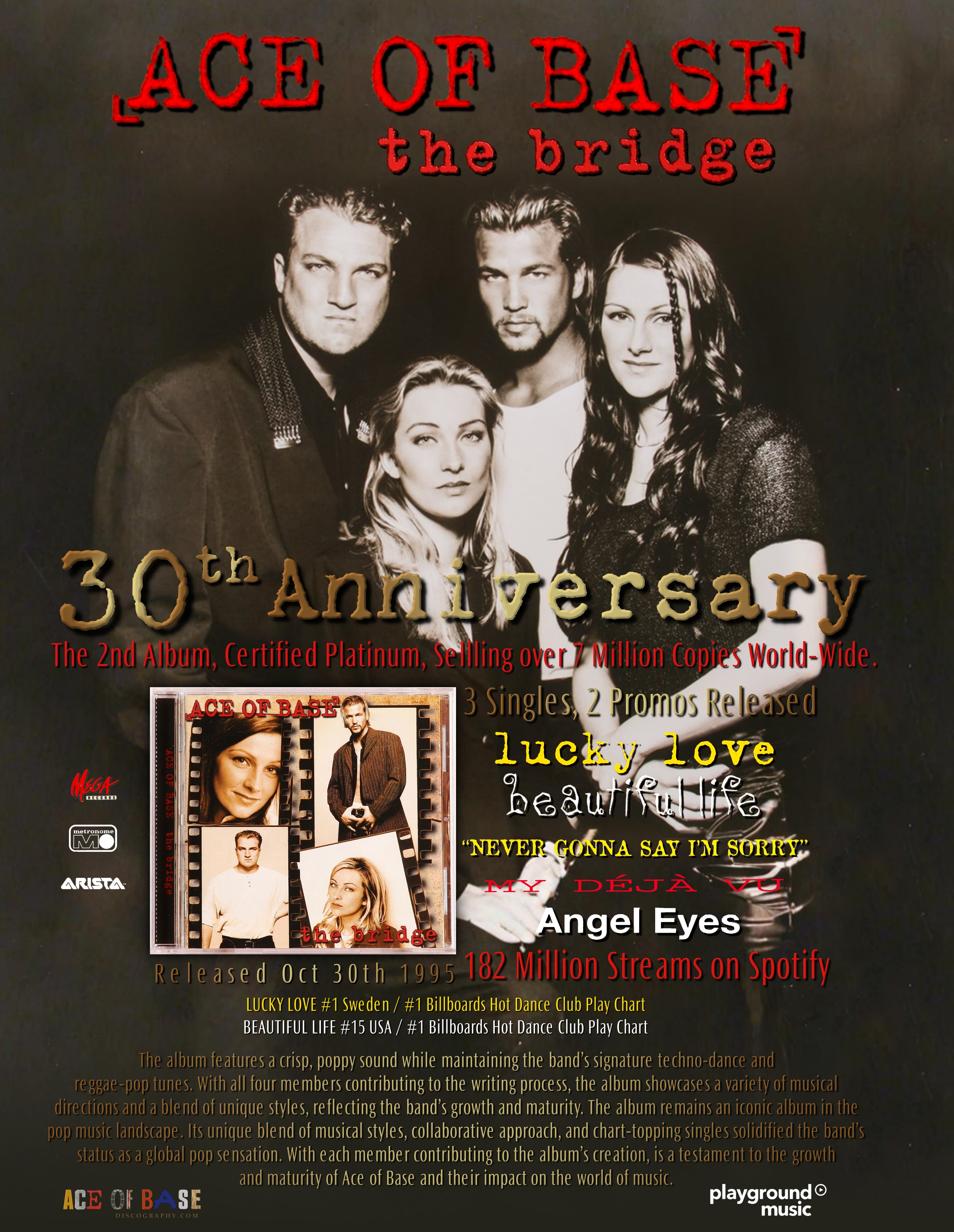 "The Bridge" is the 4th Album release and 2nd Studio Album by Ace of Base released World-Wide on October 27 , 1995. This release has mainly 2 different editions the European and American editions, the European edition contains "You and I" and 2 Version of "Lucky Love" the Original Version and the Acoustic Version, while the American Edition only includes "Lucky Love" Acoustic Version. For the release of "The Bridge" the single "Lucky Love" was release first in Europe and the single "Beautiful Life" was released as the first single in the USA simultaneously. "Lucky Love" was the second American single and Arista selected the "Acoustic Version" would be the official version for America and contained its own video. When production of The Bridge began Mega Records had submitted the non Refined Version of "Strange Ways", "My Deja Vu" & "Whispers In Blindness" and were used to manufacture millions of copys before they caught these. "Refined Versions" were corrected and added to later released for Scandinavia, German & Frence Editions. UK and Americans Editions all used the Refined editions. This was the first album where all 4 band memebers were involced in writing for the album. The Bridge was also the last album that Ace of Base would work with major Swedish pop producer Max Martin. Selling an estimated 7 million copies worldwide. Spanning 3 singles all around the world; "Beautiful Life", "Lucky Love" and "Never Gonna Say I'm Sorry", promotional single of "My Deja Vu" released in Scandinavia and France, and a Promo for "Angel Eyes" in 1998 was edited on a "Flowers" Hong Kong Edition. (by Ritchie Stubbs)