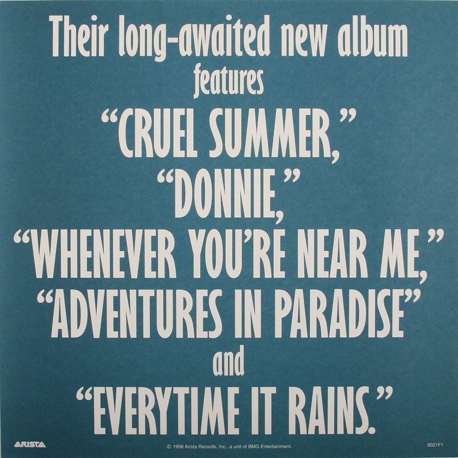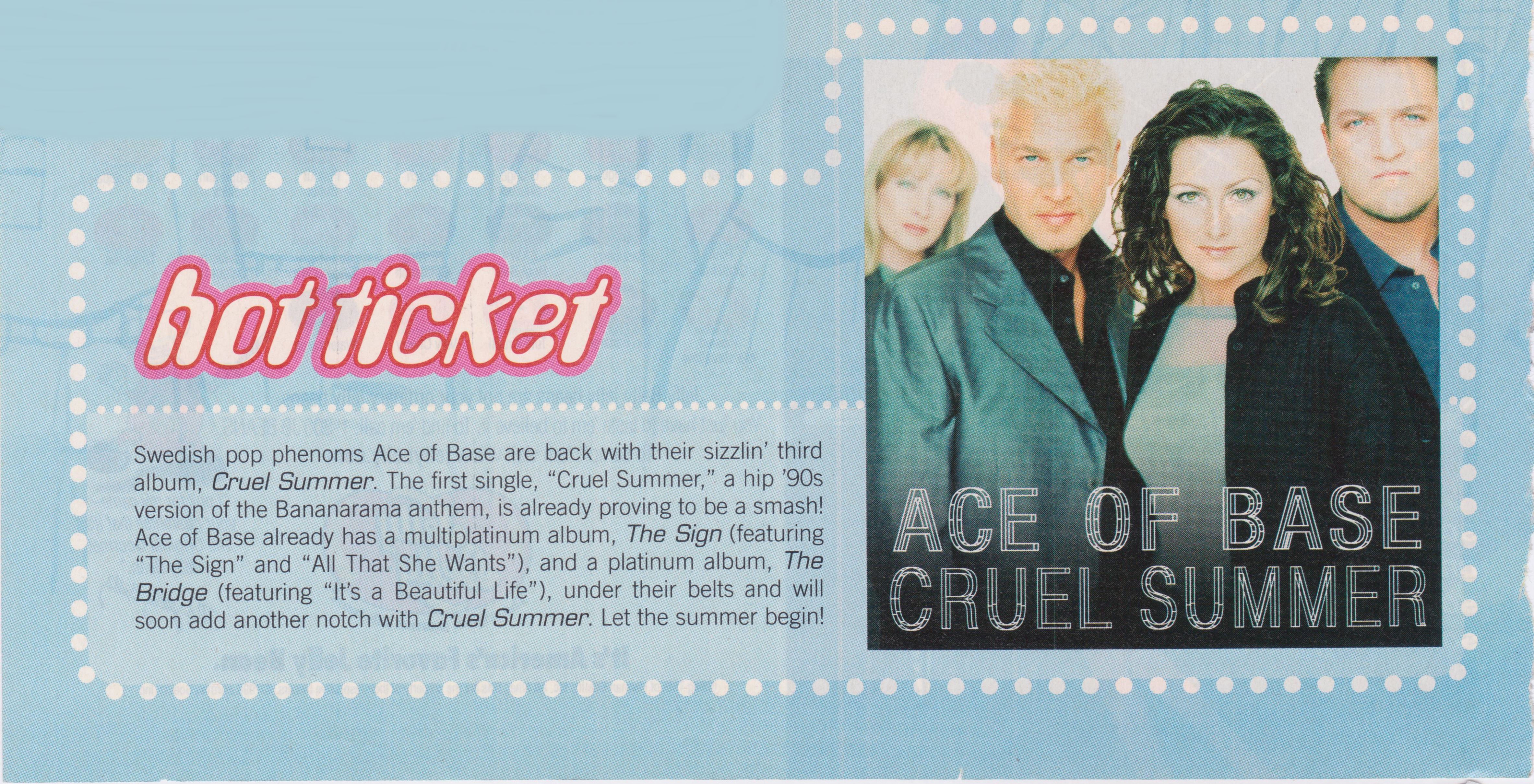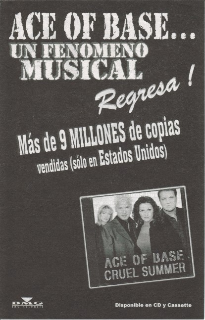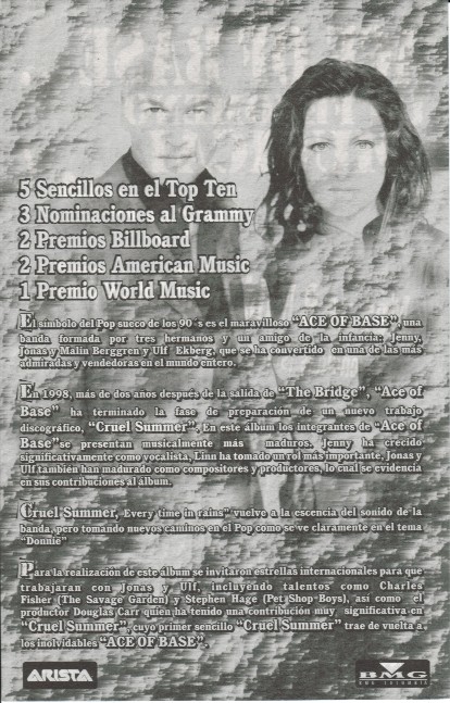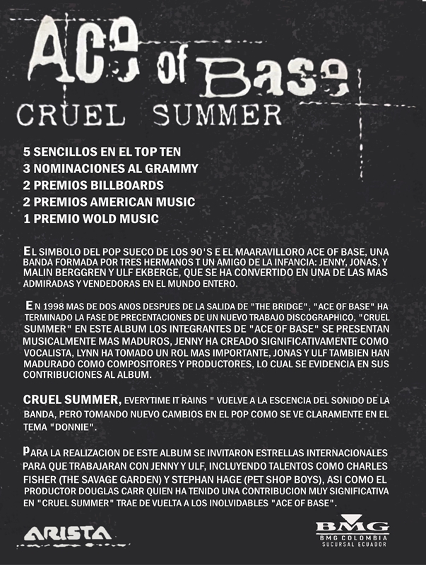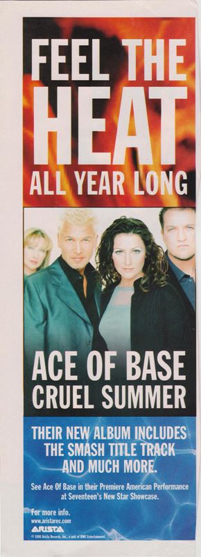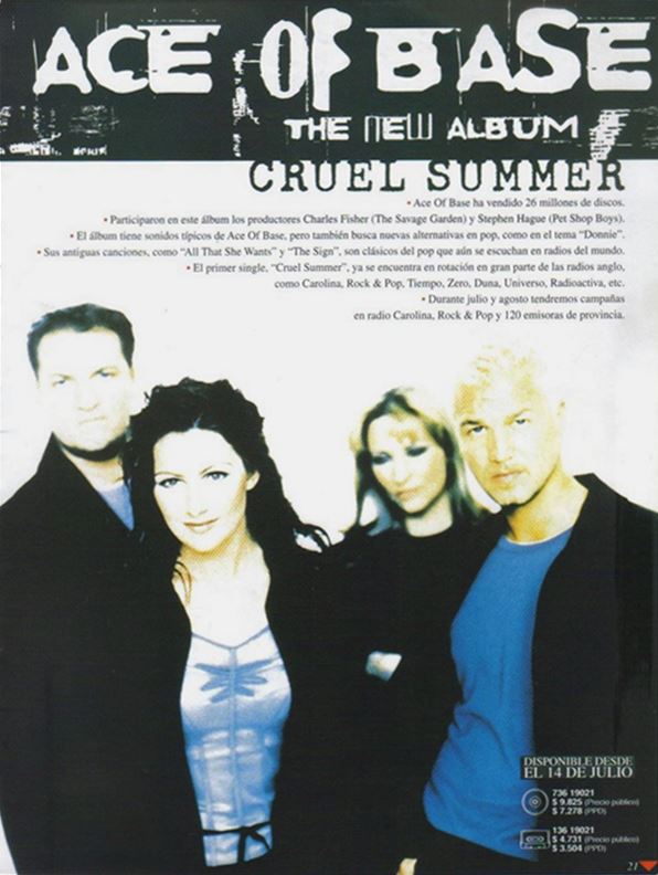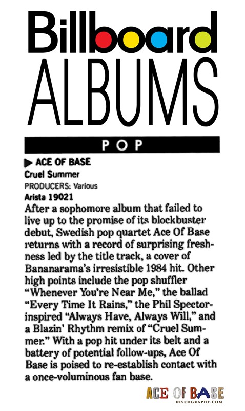 "Cruel Summer" is the name of the 3rd Studio Album release of Ace of Base for America and Japan, released on July 14, 1998. Arista Records chose instead of the title "Flowers" Ace Of Base's new cover song of from artist "Bananaramas'" "Cruel Summer" to be the lead single for release in the America. From the 2 versions of the album "Flowers" and "Cruel Summer". "Flowers" contains the songs "Dr. Sun", "I Pray", "Captain Nemo", "Cruel Summer Big Bonus Remix", the originals versions of "Travel to Romantis", "He Decides", "Donnie" and first european single "Life is a Flower". Arista Records was not thrilled with much of the euro sound of Ace of Base's latest material and made many changes with "Life Is A Flower" going through the biggest change from its title, lyrics and arrangements to a different key to the new title "Whenever You're Near Me" and released as the second single in the America, while the track "Travel To Romantis" was given to remixer "Love to Infinity" and the track "Donnie" given to producer "Ole Evenrude" to reproduce for the US Album. Ceo, Clive Davis even requested that they even sing songs from other song writers and requested that Ace of Base record the song "Everitime It Rains"with first recording made by Jenny Berggren and rejected by Clive Davis' demand to have Malin (Linn) Berggren be the lead vocal on the track, making it the only song sung completely by Malin (Linn) Berggren for the Album. For the Japanese Album release they used the same playlist as the US album except for the song "Whenever Your Near Me" replaced by "Life Is A Flower" and released as first single in Japan, the Japanese album also added the Songs "Dr. Sun" and a special B side titled "Into The Night Of Blue". Charts performance was great for the first single "Cruel Summer" reaching the top #10th spot in the USA, Arista then released "Whenever You're Near Me" with much disappointment the song only charted at #76 and no singles released after in the USA. A final second Promotional CD single of "Donnie" was released in Japan. By Ritchie Stubbs