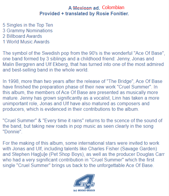 All artwork, multimedia files relating to the work of Ace of Base included on these pages is provided for strictly non-profit research.