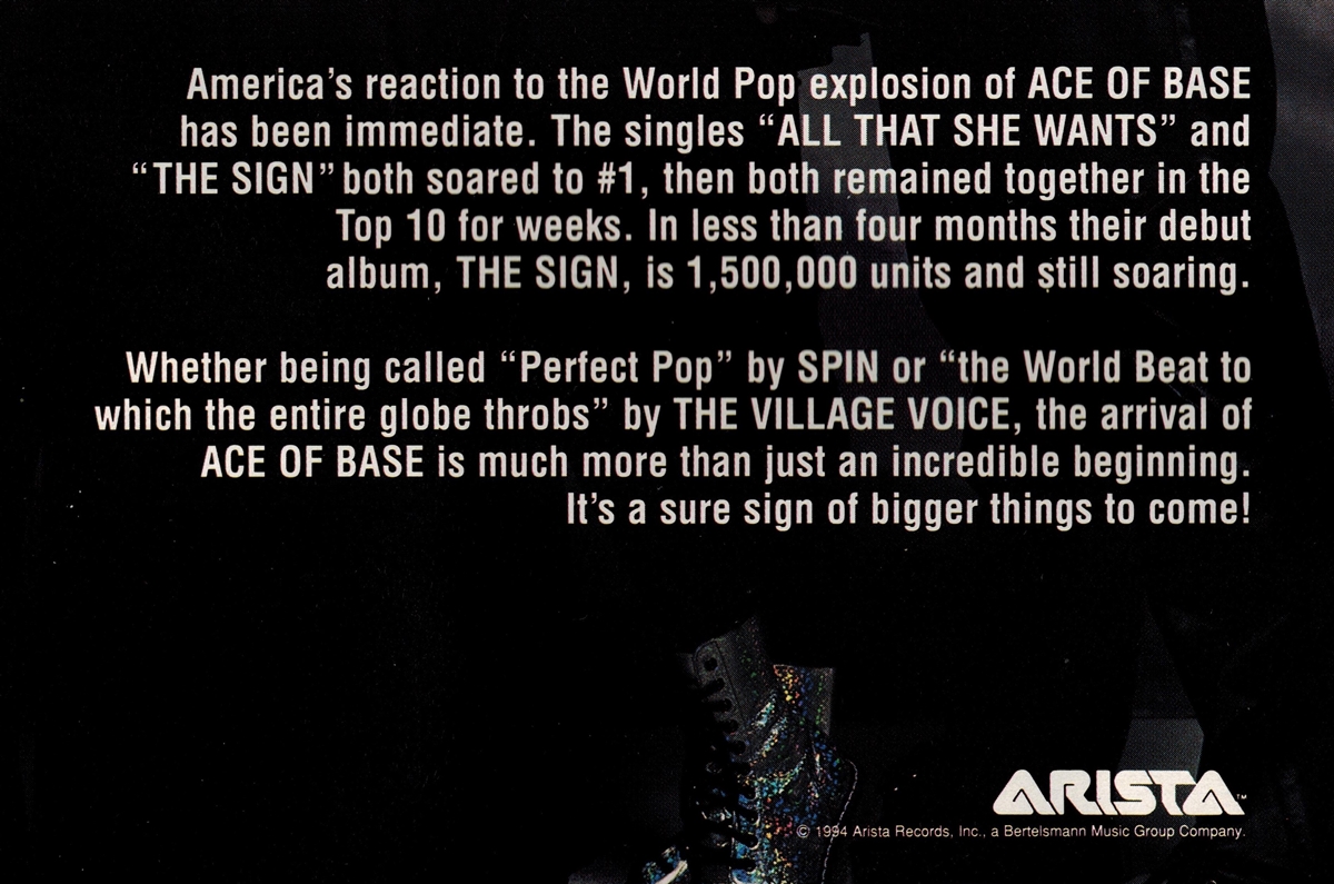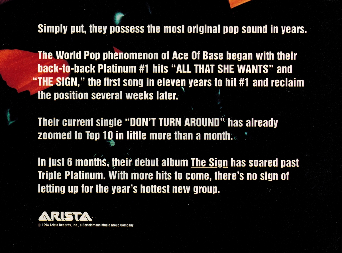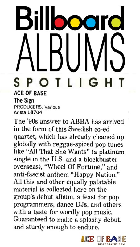 "The Sign" is the 2nd Album released by Ace of Base world-wide and the debute album to the USA & Japan on November 23, 1993. It was a reedition of the first Album "Happy Nation" that included 3 new tracks "The Sign" "Don't Turn Around" & "Living In Danger". This Album excluded the tracks "Dimention of Depth", "Munchhausen (Just Chaos)" & "Fashion Party" from the Album "Happy Nation" and "Hear Me Calling" from the Album "Happy Nation US Version". "The Sign" was remarketed for the American market and released by the title "The Sign" in the following countries: Japan, South Africa, Zimbabwe, Ecuador, Colombia, Argentina , Paraguay y Chile, other regions and countries released it as 'Happy Nation U.S. Version". From a discography perspective there are 4 LPs released 3 of which are the 3 different editions released in Ecuador and 1 LP combo artist Promo for the USA. there was never a commercial release of an LP for Ace of Base at any point. (intro by Pablo Patricio)
