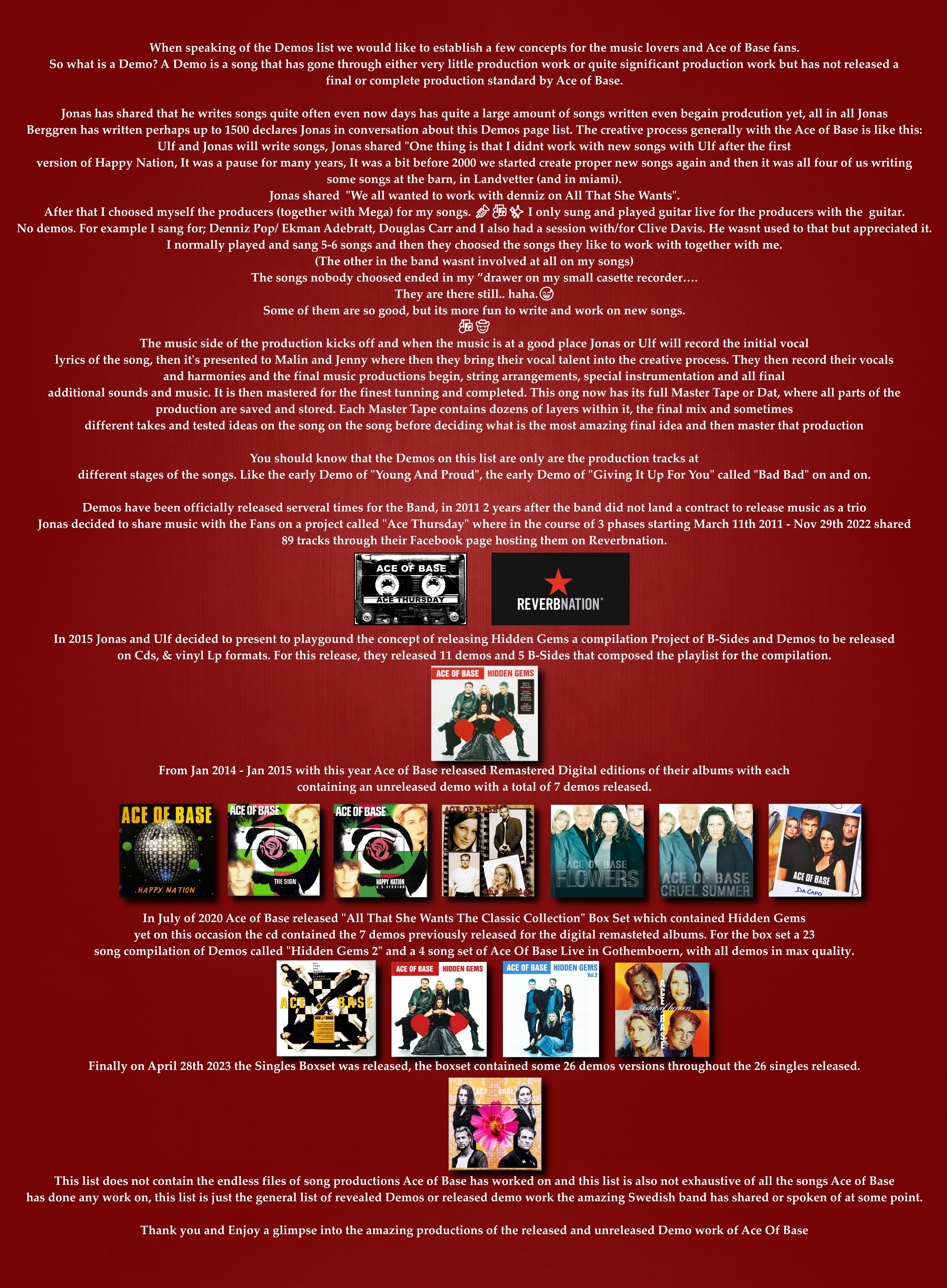All artwork, multimedia files relating to the work of Ace of Base included on these pages is provided for strictly non-profit research.